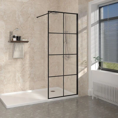 General description The NRG Walk In Wet Room Shower Screen Enclosure features a stylish square grid design in a black matte finish, enhancing the aesthetics of your bathroom. This bath screen effectively creates a comfortable showering area in your bath, preventing water spray from spreading throughout the bathroom. Technical specifications Product Size: 760 x 1950 mm Glass Thickness: 8 mm clear self-cleaning glass Frame: Flat aluminum side frame Support Bar: Stainless steel, can be cut to size Adjustable Distance: 15 mm for out of true wall CE Marked Product Installation Can be fitted for either left or right-hand opening Note: Does not include shower tray or return panel