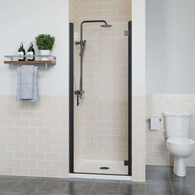 General description This hinged shower door is perfect for smaller bathrooms, featuring silky-smooth hinges that provide a generous opening width for easy entry. Its minimalist frameless design is complemented by 6mm toughened glass, ensuring exceptional strength and durability. You also have the option to add a side panel to create a complete enclosure. Technical specifications Material: 6mm toughened safety glass Height: 1900mm Door Entry Widths: W 700mm (680-720mm) - 570mm; W 760mm (740-780mm) - 630mm; W 800mm (780-820mm) - 670mm; W 900mm (880-920mm) - 770mm; W 1000mm (980-1020mm) - 870mm Profile: High quality polished chrome/matte black aluminum Hinges: Brass Handles: Stainless steel Magnetic seal for watertight closure Adjustment: 20mm out of true wall adjustment on each side Certification: CE & BS EN 12150 certified Easy clean glass on the inside Installation Can be fitted to left or right hand Easy installation process