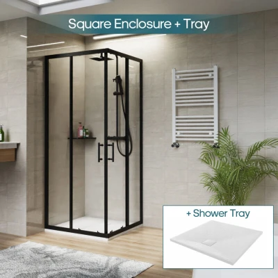 General description NRG Square Black Sliding Doors Corner Entry Shower Enclosure is a stylish and functional addition to any bathroom. This enclosure features a universal design with a sleek matte black aluminum profile and clear self-clean glass panels, providing both elegance and practicality. Technical specifications Product Size: 900 x 900 x 1900 mm Door Entry Width: 480 mm Glass Thickness: 6 mm clear self-clean glass Height: 1900 mm Adjustable Distance for Out of True Wall: 20 mm Tray Type: Square Tray Colour: White Tray Material: SMC Tray Height: 32 mm Tray Length: 900 mm Tray Width: 900 mm Waste Hole Size: 90 mm Waste Location: Side of Tray Drain Cover Size: 12 x 12 cm Installation Easy to install with full installation instructions included All necessary fixings are provided It is recommended to have a qualified professional install this item Usage Features a water-tight magnetic closing mechanism for a secure fit 16 metal wheels system ensures smooth sliding and durability