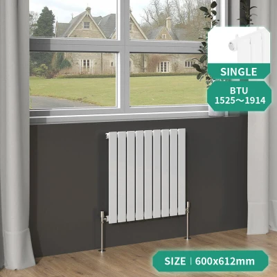 General description Our Designer Radiator offers a contemporary heating solution at a competitive price. It easily integrates into your central heating system like a standard household radiator, ensuring a straightforward installation process. The radiator features a sleek flat panel design in gloss white, making it suitable for any interior decor. Technical specifications Material: 1.5mm premium mild steel Model: Single Flat Panel in Gloss White Size: 600x612mm (HxW) Bars: 9 Water inlet/outlet size: 1/2" Other information Tested under high hydraulic pressure to ensure impermeability Triple layered finish to exceed 200 hours of neutral acid salt spray testing Tested to BS & EN442 Complies with ISO9001:2008 regulations All radiators come with a 15-year guarantee