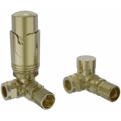 NRG Brushed Brass Corner Thermostatic Valve Bathroom Towel Rail Radiator Valves with Free Lockshield