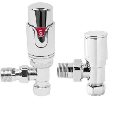 General description These thermostatic radiator valves provide efficient temperature control for your radiator, beautifully engineered to fit into any modern or minimalist bathroom. Technical specifications Finish: Chrome Thermostatic Control Connections: 15mm inlet, 1/2" BSP MI outlet Built-in sensor with liquid-filled element Industry standard - 15mm connection Compatibility and accessories Pack Includes: 1 x 15mm Chrome Angled Thermostatic Radiator Valve 1 x 15mm Chrome Angled Manual Valve