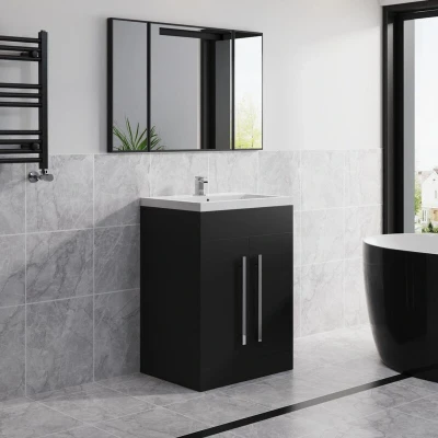 General description The Matt Black 600mm Floor Standing Vanity Unit Basin Sink is a stylish and functional addition to any bathroom. Featuring a sleek Matt Black finish, this unit combines modern aesthetics with practical design. The cabinet includes soft-closing doors with chrome handles, ensuring a smooth and quiet operation. Technical specifications Vanity Unit dimensions: 810 x 590 x 445mm (HxWxD) Basin Top dimensions: 40 x 590 x 450mm (HxWxD) Basin material: Polyglomerate (crushed stone & resin composition) Installation Self-assembly required with easy-to-follow instructions provided. Usage Designed for use in bathrooms as a floor-standing vanity unit. Other information Includes: 600mm Resin Basin Vanity Unit (Flat Pack) Excludes: Basin Tap and Waste not included.