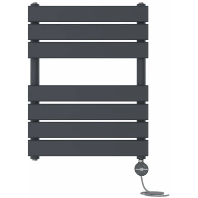 General description The Prefilled Thermostatic Electric Flat Panel Heated Towel Rail Ladder Warmer Radiator in Anthracite is a stylish and modern addition to any bathroom. With its contemporary design, it seamlessly fits into various interior styles while providing efficient heating for your towels. Technical specifications Dimensions: 650x500mm Material: Low carbon steel Power: AC230V/50HZ Temperature setting range: 30°C to 70°C Connection Size: 1/2" BSP connection thread IP Rating: IPX4 Appliance Class: Class 1 Cable Length: Approximately 1.1m Element tube lengths: 150W - 245mm, 200W - 245mm, 250W - 315mm, 300W - 315mm, 400W - 395mm, 500W - 465mm, 600W - 545mm, 700W - 685mm, 800W - 685mm, 1000W - 755mm Compatibility and accessories Compatible for use on all UK heating systems (tank fed or combi systems) Comes with T-piece and blanking plug Valves are not included Installation Tested under high hydraulic pressure to ensure impermeability Installation should be performed by a