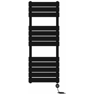 General description The Prefilled Thermostatic Electric Flat Panel Heated Towel Rail Ladder Warmer Radiator in black (1200x450mm) combines contemporary style with modern functionality, making it a perfect addition to any bathroom. Its sleek design and elegant finish enhance the aesthetic of your space while providing efficient heating for your towels. Technical specifications Material: Low carbon steel Dimensions: 1200mm x 450mm Power: AC230V/50HZ Temperature setting range: 30°C to 70°C Connection Size: 1/2" BSP connection thread IP Rating: IPX4 Appliance Class: Class 1 Cable Length: Approximately 1.1m Element tube lengths: 150W/200W - 245mm, 250W/300W - 315mm, 400W - 395mm, 500W - 465mm, 600W - 545mm, 700W/800W - 685mm, 1000W - 755mm Compatibility and accessories Compatible for use on all UK heating systems (tank fed or combi systems) Comes with T-piece and blanking plug Valves are not included Installation Tested under high hydraulic pressure to ensure impermeability