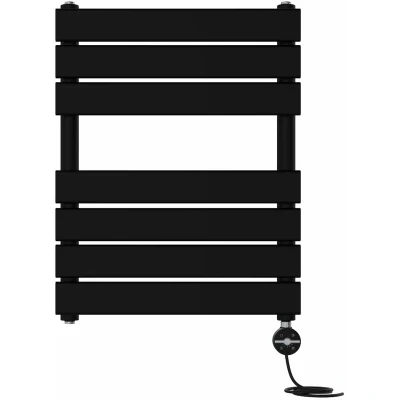 General description The Prefilled Thermostatic Electric Flat Panel Heated Towel Rail Ladder Warmer Radiator in black (650x500mm) combines contemporary style with modern functionality, making it a perfect addition to any bathroom. Its sleek design and smooth finish enhance the aesthetic of your space while providing efficient heating for your towels. Technical specifications Material: Low carbon steel Dimensions: 650mm x 500mm Power: AC230V/50HZ Temperature setting range: 30°C to 70°C Connection Size: 1/2" BSP connection thread IP Rating: IPX4 Appliance Class: Class 1 Cable Length: Approximately 1.1m Element tube lengths: 150W/200W - 245mm, 250W/300W - 315mm, 400W - 395mm, 500W - 465mm, 600W - 545mm, 700W/800W - 685mm, 1000W - 755mm Compatibility and accessories Compatible for use on all UK heating systems (tank fed or combi systems) Comes with T-piece and blanking plug Valves are not included Installation No specific installation instructions provided. Usage The thermostatic heating
