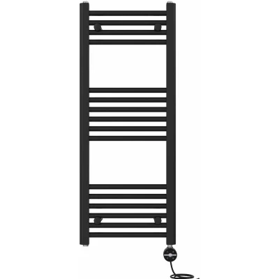 General description The NRG Prefilled Thermostatic Electric Straight Heated Towel Rail Radiator is a stylish and modern addition to any bathroom. With a sleek black finish, it complements various interior designs while providing efficient heating for your towels. This radiator is constructed from low carbon steel and has been rigorously tested for impermeability, ensuring durability and reliability. Technical specifications Dimensions: 1000 x 400 mm Material: Low carbon steel Power: AC230V/50HZ Temperature setting range: 30°C to 70°C Connection Size: 1/2" BSP connection thread IP Rating: IPX4 Element tube length: 150W - 245mm, 200W - 245mm, 250W - 315mm, 300W - 315mm, 400W - 395mm, 500W - 465mm, 600W - 545mm, 700W - 685mm, 800W - 685mm, 1000W - 755mm Compatibility and accessories Compatible for use on all UK heating systems (tank fed or combi systems) Comes with T-piece and blanking plug Valves are not included Installation Tested under high hydraulic pressure to ensure impermeability