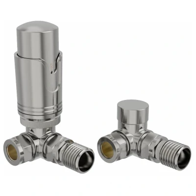 General description These Thermostatic TRV Lockshield Corner Radiator Valves are designed for efficient temperature control in your central heating system. The set includes both a thermostatic radiator valve and a lockshield valve, making it ideal for use with radiators or towel rails. Technical specifications Connections: 15mm inlet, 1/2" BSP outlet Radiator Valve Type: Thermostatic + Lockshield Material: ABS/Brass Colour: Satin Nickel Compatibility and accessories Suitable for central heating radiators or towel rails Other information Pack includes: One Thermostatic Radiator Valve and one Lockshield Radiator Valve