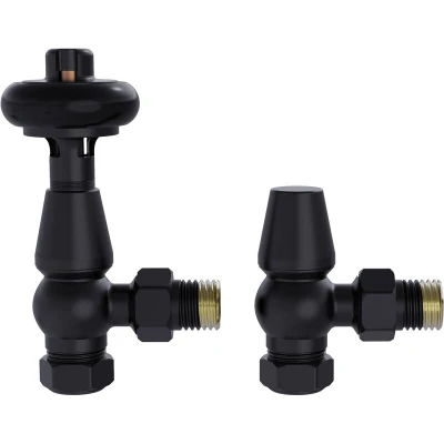 General description Traditional Antique Design TRV Thermostatic Brass Angled Radiator Valves Pair in Black are designed to enhance the aesthetic of your heating system while providing efficient temperature control. These valves are suitable for use with central heating radiators or towel rails. Technical specifications Material: Brass Style: Angled Connections: 15mm inlet, 1/2" BSP MI outlet Colour: Black Set Includes: 1pc of Thermostatic Valve & 1pc of Lock-Shield Valve Installation We recommend consulting a qualified plumber for the installation of this item. Other information Images for illustration purposes - colours may differ depending on your device screen and lighting 5 years fit and forget Guarantee