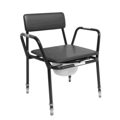 Shortern height range to suit a greater variety of people Seat height: 381–533½mm (15 inch - 21 inch) Splayed legs for stability Easy to clean, fire retardant vinyl lift off seat and fixed back Hinged plastic toilet seat over commode pan with lid included
