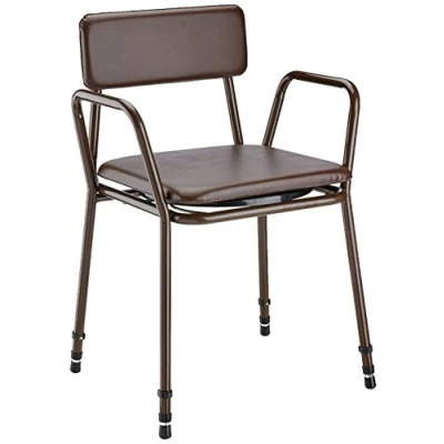 NRS Healthcare F18864 Dovedale Commode - Adjustable Height Hinged plastic toilet seat over commode pan with lid Sturdy metal and height adjustable, Splayed legs for stability Seat height adjustable between: 47 cm - 62.2 cm (18½ Inch -24 inch). Max user weight: 180 kg (28 stone) Easy to clean, fire retardant, vinyl lift off seat and fixed back