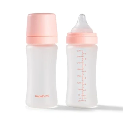 Nuby Pack of 2 RapidBottle Anti Colic Glass Feeding Bottles Silicone Coated with Breast Like Teat Quick Feed No Microplastics Fast Sterilising 9oz (Pink)