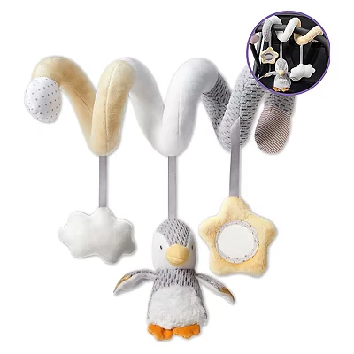 SPIRAL PRAM TOY – This spiral travel toy is designed to wrap around the pushchair bar or the car seat handle, ensuring entertainment while on the road. SENSORY TOY - These buggy toys stimulate baby's senses with playful squeaks and chimes plus different textures for them to explore. PENGUIN PLUSH TOY Hanging toys include cuddly penguin teddy that chimes, a fun mirror and a cute plush cloud that squeaks to keep little ones entertained on-the-go. SUITABLE FROM BIRTH – The gorgeous, neutral unisex colours make it a great gift for any new-born baby. PENGUIN COLLECTION – This baby pram toy is part of our penguin collection; related items are available in our Store.