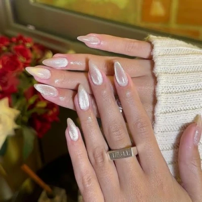 Nude False Nails Glitter, SXVME Cat Eye Press on Short Almond, Sparkly Shiny Fake With Design, Cute Bling Glue Stiletto Stick for Women Party Holiday Wear, 30 Pcs