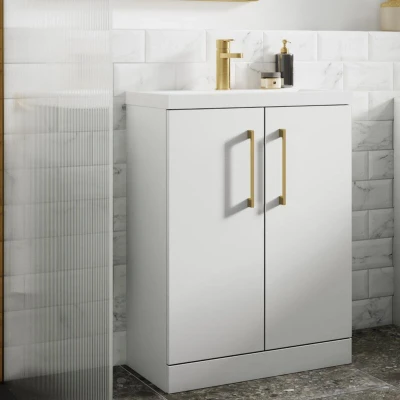 The elegant floor-mounted Arno vanity unit is part of Nuie's extensive bathroom furniture collection - available with a choice of 4 different ceramic basins and in 5 different colours to allow total customisation and design flexibility. This 2-door version of the vanity unit offers excellent storage space thanks to an internal shelf. This Arno vanity unit design is also available in several woodgrain finishes - available separately. Features and Benefits: Floor-standing vanity unit measuring 500mm wide Unit painted in a classic gloss white finish Includes thin-edge ceramic basin with deep 50mm profile Unit includes 2 doors, each with 95-degree soft-closing hinges Supplied with 2 x chrome bar handles (alternative finishes available as upgrades) Cabinet constructed from 16mm MFC with 18mm MDF fascia Unit includes an internal shelf for extra storage capabilities Vanity unit supplied rigid - no assembly required on the carcass/cabinet Unit includes pre-drilled blind holes for installation