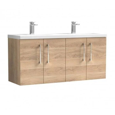 Nuie Arno Bleached Oak Woodgrain 1200mm Wall Hung 4 Door Vanity Unit and Double Ceramic Basins ARN3023F