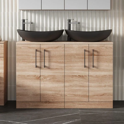 ManoManoThe large twin Arno vanity unit offers excellent storage space and an unmissable woodgrain finish to give it a premium upgrade from solid colours. Almost every facet of this highly-customisable cabinet can be personalised - multiple cabinet finishes, handles and vessel basins can all be used to help create your dream bathroom. Features and Benefits: Modern vanity unit design with vast array of customisations available Premium bleached oak woodgrain finish - a light wood shade Comprises of 2 x 600mm cabinets Supplied with a colour-matched countertop to give an identical look and feel 2 sets of double doors with 95 degree soft close hinges for premium feel Supplied with chrome D-handles (192mm centres) as standard Cabinet constructed from 16mm MFC with 18mm MDF fascias (door/drawer fronts) Includes an internal shelf allowing for greater organisation of toiletries Vanity unit supplied rigid - no assembly required on the carcass/cabinet Unit includes pre-drilled blind holes for