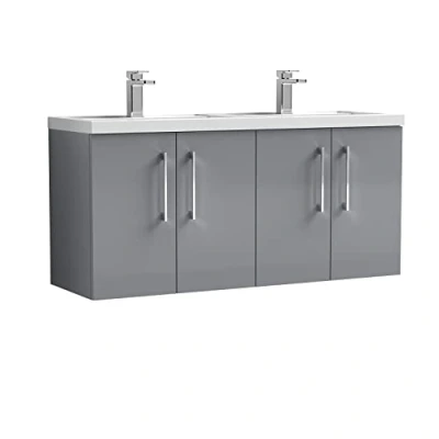 General description This Nuie Arno Satin Grey 1200mm Wall Hung 4 Door Vanity Unit with Double Polymarble Basins is a perfect combination of functionality and modern design, ideal for contemporary bathrooms. Crafted from high-quality MDF with a stunning satin finish, it ensures durability and style. The sleek, wall-hung design optimizes space while serving as a striking focal point. It features four soft-close doors for quiet access to your essentials and two integrated polymarble basins that enhance usability and aesthetic appeal. Technical specifications Model Number: ARN2223C Vanity Unit Dimensions: W:1205mm x H:390mm x D:175mm Basins Dimensions: W:600mm x H:539mm x D:383mm Compatibility and accessories Compatible with a range of mono basin mixer taps Basin tap and waste sold separately unless specified Usage Ideal for contemporary bathroom setups Soft-close doors provide easy access to bathroom essentials Other information 5-year guarantee for peace of mind