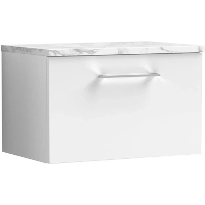 Nuie Arno Wall Hung 1 Drawer Vanity Unit with Carrera Marble Worktop 600mm Wide Gloss White