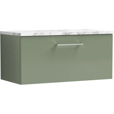 Nuie Arno Wall Hung 1 Drawer Vanity Unit with Carrera Marble Worktop 800mm Wide Satin Green