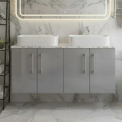 The twin Arno vanity unit effortlessly showcases the clever design, allowing greater storage space by seamlessly doubling up on the popular 600mm version. This beautifully-designed cabinet comes in a variety of contemporary colours, with the option to switch out the handles to match taps and other accent colours in your bathroom. Features and Benefits: Modern vanity unit design with vast array of customisations available Understated satin grey finish offers a soft contrast against white ceramics Comprises of 2 x 600mm cabinets Includes laminate countertop in Carrera Marble - a light Italian marble effect finish 2 sets of double doors with 95 degree soft close hinges for premium feel Supplied with chrome D-handles (192mm centres) as standard Cabinet constructed from 16mm MFC with 18mm MDF fascias (door/drawer fronts) Vanity unit supplied rigid - no assembly required on the carcass/cabinet Unit includes pre-drilled blind holes for installation of handles (supplied loose) Unit