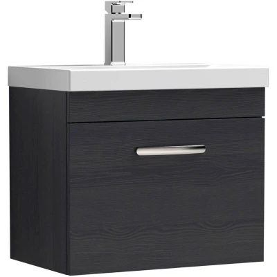 Nuie Athena Charcoal Black Woodgrain 600mm Wall Hung Single Drawer Vanity Unit and Thin Edge Ceramic Basin ATH040D