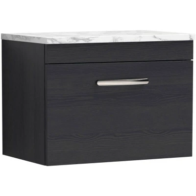 Nuie Athena Wall Hung 1 Drawer Vanity Unit with Carrera Marble Worktop 600mm Wide Charcoal Black Woodgrain