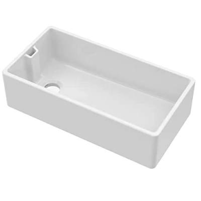 AmazonA luxurious focal point to your kitchen, this single bowl fireclay Belfast sink with overflow combines high quality manufacturing with timeless design. A smooth non-porous glaze ensuring robust, hardwearing surface in a classic White finish to complement both modern and traditional kitchen designs. Created using a traditional fire clay method making it durable and authentic. Manufactured and hand finished to the highest quality to bring you a reliable sink. Long and deep basin, for larger and busier kitchens with plenty washing space. Finish with basket strainer waste - not included. Built in overflow. DIMENSIONS - H: 245mm, W: 895mm, D: 455mm 10 year manufacturer's guarantee, Weight: 107.585583856 pounds, Manufacturer: nuie
