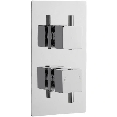 Features and Benefits: Shower valve supplies water to 2 outlets Can be fitted vertically or horizontally Minimalist sleek design Thermostatic control to +/- 2 degree - even if the water pressure fluctuates Full thermal protection to prevent scalding in the event of hot or cold water shut off In the event of hot or cold water failure the valve will shut down as per the relevant standard Square design for an ultra modern look Our valves are suitable for use with all systems: gravity fed pumped unvented high pressure or fully modulated combi-boilers The unique cartridge is highly resistant to calcium build up - even in hard water areas Suitable for use on the majority of plumbing systems Excellent flow rates, even at low pressure Twin handle valve with diverter Accurate flow control Patented Valquest cartridge - Made in Britain Our valves are suitable for medium pressure water systems Manufactured from high quality brass & ABS The cartridge is fully reversible meaning if hot and cold