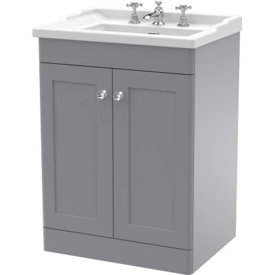 Nuie Classique Floor Standing 2 Door Vanity Unit with Traditional Basin 600mm Wide Satin Grey 3 Tap Hole
