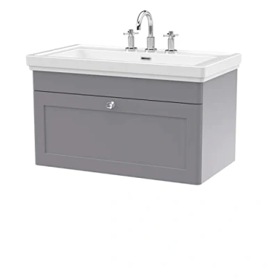 Nuie Classique Satin Grey 800mm Wall Hung Single Drawer Vanity Unit and Classic Fireclay Basin with 3 Tap Holes CLC296B