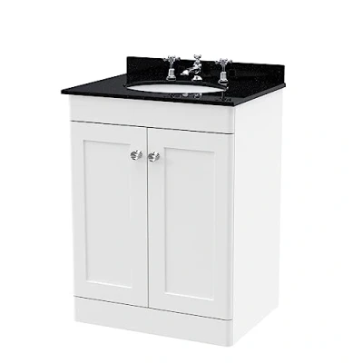 Eye catching and elegant, the Classique range of bathroom furniture from nuie combines Victorian inspired design with a contemporary twist. The traditional design is complemented in 5 modern colourways, with a large variety of different basins and worktops - to find the perfect unit for your bathroom. This floor standing vanity unit will endure as a much loved piece in your bathroom. With 2 soft close Shaker style doors and ample storage for the essentials to be kept tidily away. In a light Satin White finish with light Chrome handles. With a striking Black marble worktop. Supplied rigid for easier installation. With a 3 tap hole Marble top with high quality vitreous china ceramic white basin. Manufactured from high quality materials and manufactured to our highest standards. Matching furniture available in the Classique furniture range from nuie for a beautifully traditional design in your bathroom. Tap and waste not included. DIMENSIONS - H: 878mm, W: 620mm, D: 470mm 5 year manufacturer's guarantee, Weight: 85.539357656 Pounds, Manufacturer: nuie