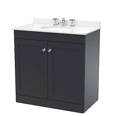 nuie CLC1426WR3 Classique Floor Standing 2 Door Unit & 3 Tap Hole Marble Worktop with Round Basin, 800mm, Satin Anthracite/White, Soft Black