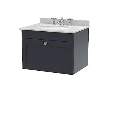 nuie CLC1494GR3 Classique Wall Hung 1 Drawer Unit & 3 Tap Hole Marble Worktop with Round Basin, 600mm, Satin Anthracite/Grey, Soft Black