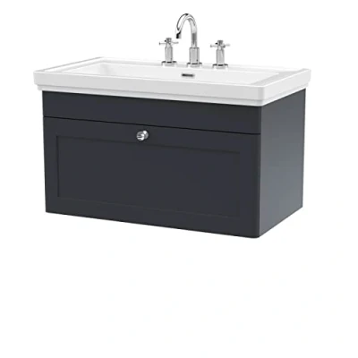 nuie CLC1496B Classique Traditional Bathroom Wall Hung 1 Drawer Vanity Unit with 3 Tap Hole Fireclay Basin, 800mm, Soft Black
