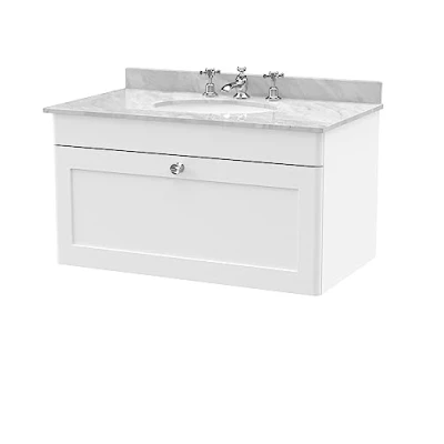Eye catching and elegant, the Classique range of bathroom furniture from nuie combines Victorian inspired design with a contemporary twist. The traditional design is complemented in 5 modern colourways, with a large variety of different basins and worktops - to find the perfect unit for your bathroom. This space saving wall hung vanity unit will endure as a much loved piece in your bathroom. With 1 soft close Shaker style drawer and ample storage for the essentials to be kept tidily away. In a light Satin White finish with light Chrome handles. Supplied rigid for easier installation. With a 3 tap hole Marble top with high quality vitreous china ceramic white basin. Manufactured from high quality materials and manufactured to our highest standards. Matching furniture available in the Classique furniture range from nuie for a beautifully traditional design in your bathroom. Tap and waste not included. DIMENSIONS - H: 509mm, W: 820mm, 470mm 5 year manufacturer's guarantee, Weight: 90.38952742 Pounds, Manufacturer: nuie