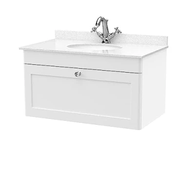 nuie CLC196WR1 Classique Wall Hung 1 Drawer Unit & Tap Hole Marble Worktop with Round Basin, 800mm, Satin White