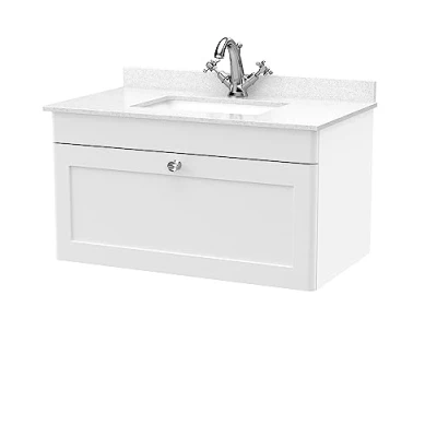 nuie CLC196WS1 Classique Wall Hung 1 Drawer Unit & Tap Hole Marble Worktop with Square Basin, 800mm, Satin White