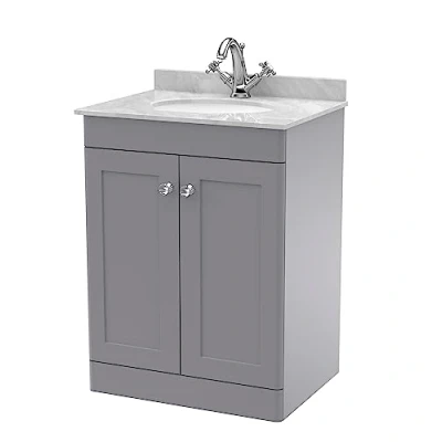 nuie CLC225GR1 Classique Floor Standing 2 Door Unit & 1 Tap Hole Marble Worktop with Round Basin, 600mm, Satin Grey