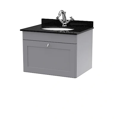 nuie CLC294BR1 Classique Wall Hung 1 Drawer Unit & Tap Hole Marble Worktop with Round Basin, 600mm, Satin Grey/Black