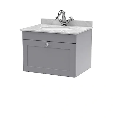 Eye catching and elegant, the Classique range of bathroom furniture from nuie combines Victorian inspired design with a contemporary twist. The traditional design is complemented in 5 modern colourways, with a large variety of different basins and worktops - to find the perfect unit for your bathroom. This space saving wall hung vanity unit will endure as a much loved piece in your bathroom. With 1 soft close Shaker style drawer and ample storage for the essentials to be kept tidily away. In a cool Satin Grey finish with light Chrome handles. Supplied rigid for easier installation. With a 1 tap hole Marble top with high quality vitreous china ceramic white basin. Manufactured from high quality materials and manufactured to our highest standards. Matching furniture available in the Classique furniture range from nuie for a beautifully traditional design in your bathroom. Tap and waste not included. DIMENSIONS - H: 509mm, W: 620mm, D: 470mm 5 year manufacturer's guarantee, Weight: 71.65023515 pounds, Manufacturer: nuie
