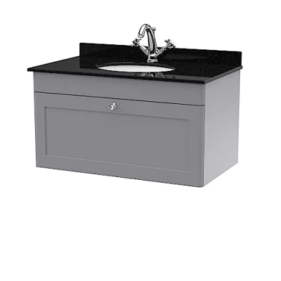 nuie CLC296BR1 Classique Wall Hung 1 Drawer Unit & Tap Hole Marble Worktop with Round Basin, 800mm, Satin Grey/Black