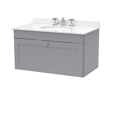 nuie CLC296WR3 Classique Wall Hung 1 Drawer Unit & 3 Tap Hole Marble Worktop with Round Basin, 800mm, Satin Grey/White