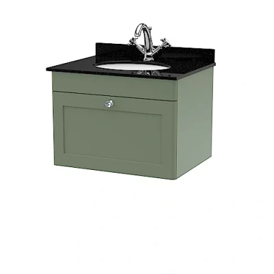 nuie CLC894BR1 Classique Wall Hung 1 Drawer Unit & Tap Hole Marble Worktop with Round Basin, 600mm, Satin Green/Black