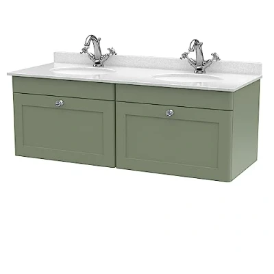 Eye catching and elegant, the Classique range of bathroom furniture from nuie combines Victorian inspired design with a contemporary twist. The traditional design is complemented in 5 modern colourways, with a large variety of different basins and worktops - to find the perfect unit for your bathroom. This space saving wall hung double vanity unit will endure as a much loved piece in your bathroom. With 2 soft close Shaker style drawer and ample storage for the essentials to be kept tidily away. In a relaxing Satin Green finish with light Chrome handles. Supplied rigid for easier installation. With a Marble top with double 1 tap hole high quality vitreous china ceramic white basins. Manufactured from high quality materials and manufactured to our highest standards. Matching furniture available in the Classique furniture range from nuie for a beautifully traditional design in your bathroom. Tap and waste not included. DIMENSIONS - H: 509mm, W: 1220mm, D: 470mm 5 year manufacturer's guarantee, Weight: 144.40278161 pounds, Manufacturer: nuie