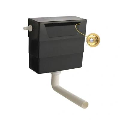 Save on water bills with the Nuie dual flush cistern, featuring a brushed brass traditional push button. It's available in black, made from stainless steel and HD Polyethylene for enhanced durability and long life. The cistern offers front and top access for ease of use. It measures 334mm in height, 303mm in width, and 136mm in depth. The dual flush function aids in water conservation. The product includes a 5-year guarantee against faulty workmanship or materials. During installation, ensure care to prevent damage to fittings. The Nuie Concealed Cistern with a traditional brushed brass flush plate is a reliable and efficient choice for your bathroom.. Nuie Concealed Cistern & Traditional Brushed Brass Dual Flush Push Button HD Polyethylene