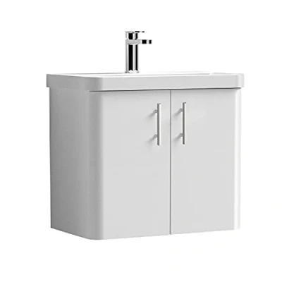 nuie COR10533 Core Modern Bathroom Furniture Bundle Wall Hung 2 Soft Close Door Vanity Basin Unit & Knurled Bar Handle, 600mm, Gloss White/Satin Chrome