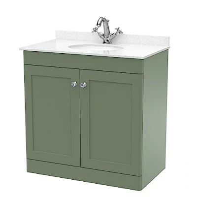 nuie Floor Standing 2 Door Unit & 1 Tap Hole Marble Worktop with Round Basin, 800mm, Satin Green/White