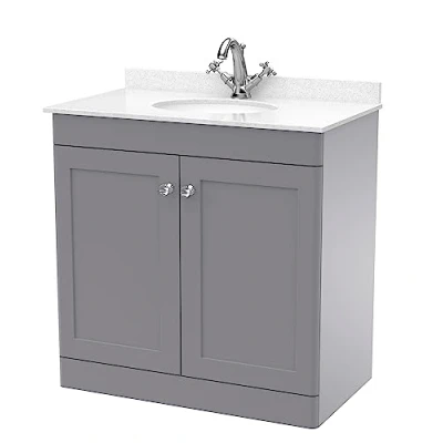 Eye catching and elegant, the Classique range of bathroom furniture from nuie combines Victorian inspired design with a contemporary twist. The traditional design is complemented in 5 modern colourways, with a large variety of different basins and worktops - to find the perfect unit for your bathroom. This floor standing vanity unit will endure as a much loved piece in your bathroom. With 2 soft close Shaker style doors and ample storage for the essentials to be kept tidily away. In a cool Satin Grey finish with light Chrome handles. Supplied rigid for easier installation. With a 1 tap hole Marble top with high quality vitreous china ceramic white basin. Manufactured from high quality materials and manufactured to our highest standards. Matching furniture available in the Classique furniture range from nuie for a beautifully traditional design in your bathroom. Tap and waste not included. DIMENSIONS - H: 878m, W: 820mm, D: 470mm 5 year manufacturer's guarantee, Weight: 106.92419707 Pounds, Manufacturer: nuie