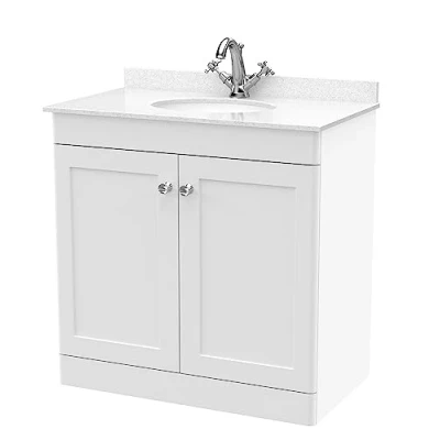 Eye catching and elegant, the Classique range of bathroom furniture from nuie combines Victorian inspired design with a contemporary twist. The traditional design is complemented in 5 modern colourways, with a large variety of different basins and worktops - to find the perfect unit for your bathroom. This floor standing vanity unit will endure as a much loved piece in your bathroom. With 2 soft close Shaker style doors and ample storage for the essentials to be kept tidily away. In a light Satin White finish with light Chrome handles. With a light White marble worktop. Supplied rigid for easier installation. With a 1 tap hole Marble top with high quality vitreous china ceramic white basin. Manufactured from high quality materials and manufactured to our highest standards. Matching furniture available in the Classique furniture range from nuie for a beautifully traditional design in your bathroom. Tap and waste not included. DIMENSIONS - H: 878mm, W: 820mm, D: 470mm 5 year manufacturer's guarantee, Weight: 106.92419707 pounds, Manufacturer: nuie